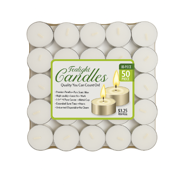 50-pack unscented white tealights (11g each). Long burn ~3.5 hours. Shrink-packed block ideal for retail or hospitality. Private label OEM available.